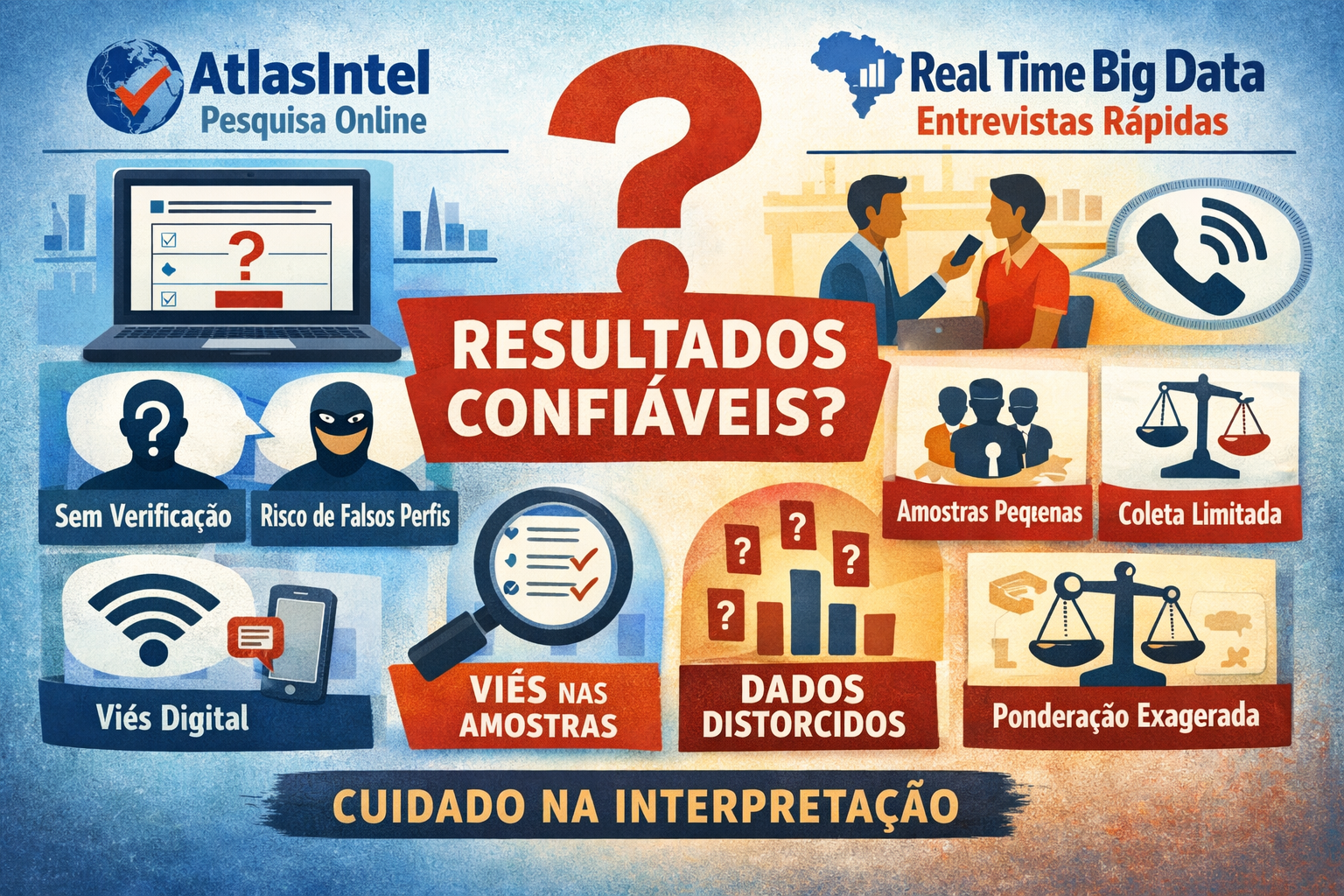 Nos últimos ciclos eleitorais, duas empresas passaram a ocupar espaço central no debate público brasileiro: AtlasIntel e Real Time Big Data. Embora utilizem metodologias distintas, ambas enfrentam críticas recorrentes quanto à confiabilidade de seus números. Entender como coletam dados — e onde estão seus pontos frágeis — é essencial para interpretar seus resultados com responsabilidade.